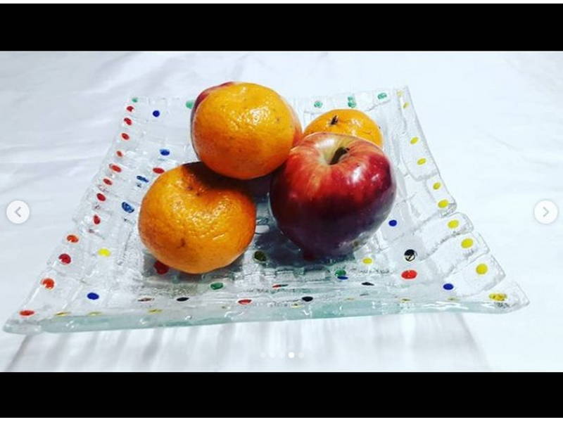 Producción unipersonal (realizadas en vidrio termo/moldeado) de platos, fuentes, portavelas, portasahumerios, relojes, veladores, jazmineros, etc.